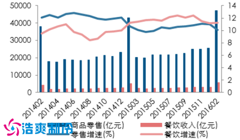 零售消费品主要分两个部分,消费收入和餐饮收入。其中,商品收入占比较高但增长具有季节性,尤其在春节时期达到高值。相比较而言餐饮收入相对稳定,常年增速保持在 11%左右。