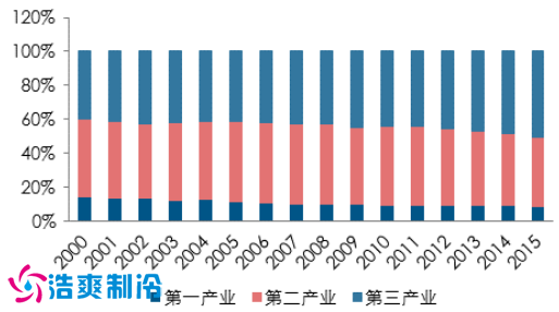 从发达国家的经验来看 ,到了工业化的后期, 第二产业占国民经济的比重将逐渐下降。 且第二产业所带来的经济效益也持续降低。 同时,第三产业将逐步取代第二产业在 GDP比例中的优势地位。截止 2015 年末,我国第三产业占 GDP 比例 50%,高出第二产业9 个百分点。同时,我国制造业的收入增长率逐年下降,利润增长率 2015 年处于负增长,2016 年由于国家各种改革和支持,虽然恢复到正增长,但依然维持在较低水平。此外, 我国第二产业的亏损企业比例 2015 年低到达了 31.3%, 而资产负债率震荡下行。