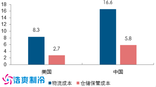 2014 年中美物流相关成本占 GDP 比例比较(%)