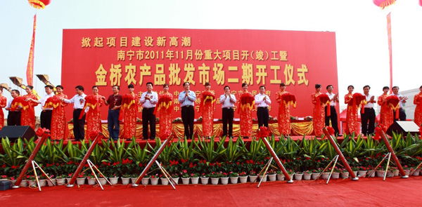11月7日,南宁金桥农产物批发市场二期开工典礼在南宁市昆仑大道进行。南宁市人大常委会主任谢寿堂,南宁市政协主席岑可成,广西交通投资团体有限公司董事长、党委书记余昌文,南宁市委副书记刘长林,自治区商务厅副厅长熊家军,南宁市委常委、秘书长杨维超及兴宁区四家班子率领等出席典礼??さ淅裼赡夏形N⒊N窀笔谐の忪恐鞒?。