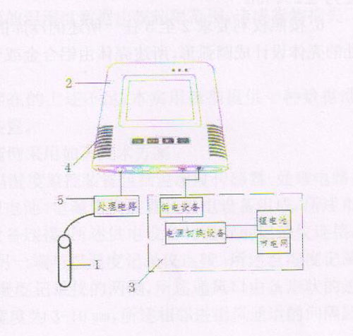 【0016】 如图1、图2所示,一种冷库的温湿度监控装置,所述温湿度监控装置包括温湿度传感器1、处理电路5、温湿度记录仪2和电源3,电源3由市电网、锂电池、电源切换装置和供电设备组成,市电网和锂电池均通过电源切换装置与供电设备连接,供电设备与温湿度记录仪2连接,处理电路5的一端与温湿度传感器1连接,另一端与温湿度记录仪2连接;温湿度记录仪2设有通风口4,通风口4对称地布置在温湿度记录仪2的两侧,通风口4由条形状的进出风通道8有规律地排列,进出风通道8的宽度为3-10mm,相邻进出风通道8的间隔距离为2mm。